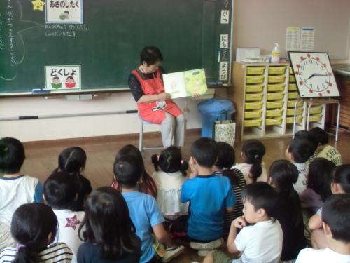 読み語り 朝の時間に、図書ボランティアの皆様による読み語りがありました。今日の対象学年は、1〜3年生。子どもたちは、読み語りをいつも楽しみにしています…