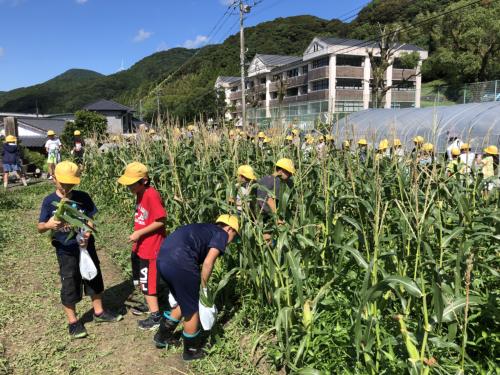トウモロコシの収穫(2・4年) 今日は、2年生と4年生が、トウモロコシの収穫をしました。今年は長雨のため、受粉がうまくいかず、また日照不足もあり、例年ほどの収穫はできません…