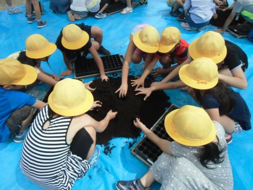 スイートコーンの種まき 2、4年生がスイートコーンの種まきをしました。三農会の皆様のご指導のもと、2年生と4年生の異学年でグループを作り、活動しました。4年生から2…