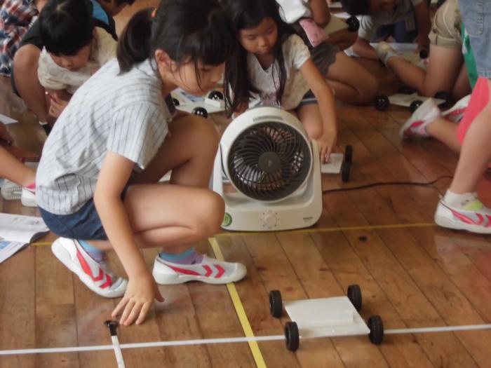 理科の学習(3年生) 「風の強さによって車の進む長さに違いがあるのかな?」