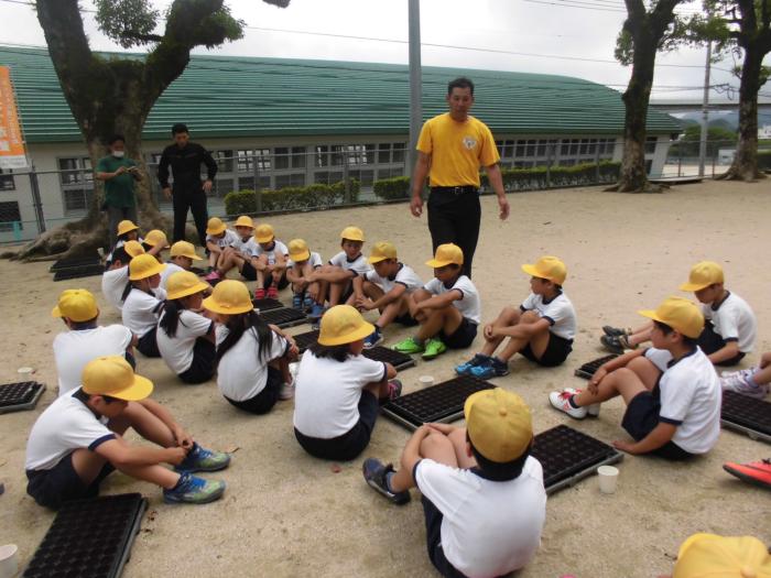 総合学習「スイートコーンを育てよう」 三農会の方に教えてもらいながら、とうもろこしの種をまきました。これから大事に育てます!