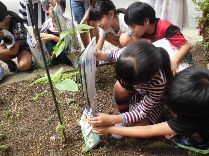 理科の学習(3年生) ヒマワリとホウセンカの様子を観察しました。大きく成長していていました。