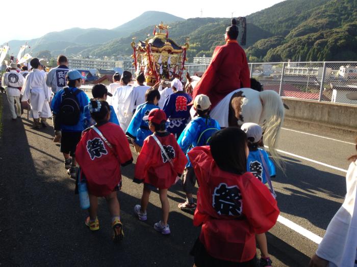 おくんちに参加しよう 10月6日(日)からはじまった「春日神社のおくんち」に参加しました。おそろいの法被を着て、おくだりの列に加わりました。