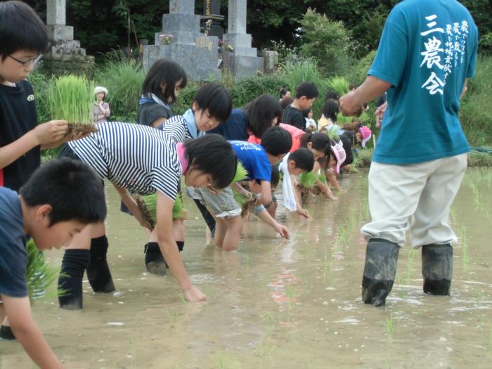 田植え(6月20日) たくさんの子どもたちが集まり、田植えが行われました。どろんこになって遊び出す子どももいましたが、楽しい時間になりました。
