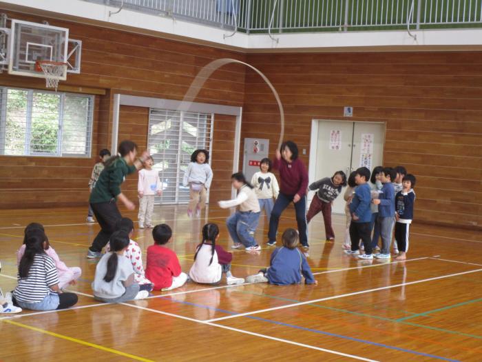 1年生は体育館で「長なわとび」を楽しんでいました。タイミングよくジャンプして成功すると、とびっきりの笑顔を見せてくれました。