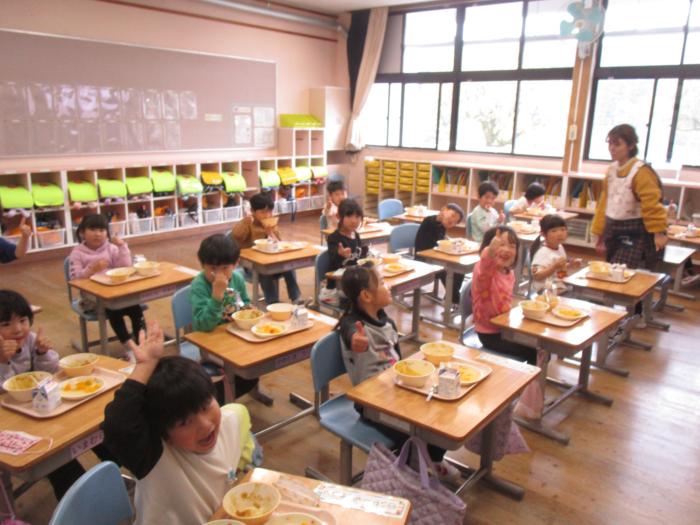 今日は新1年生にとって初めての給食です。メニューは恒例の「カレーライス」。「おいしい!」の声が聞こえてきて、とてもうれしく感じました。モリモリ食べて成長してほしいです。