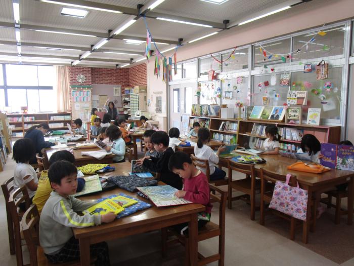 毎週月曜日と火曜日は学校司書の山口美恵子先生が来校される日です。この両日はたくさんの学年の子たちが図書室を訪れ、お気に入りの図書を借りていきます。今日は2年生が読書を楽しんでいました。