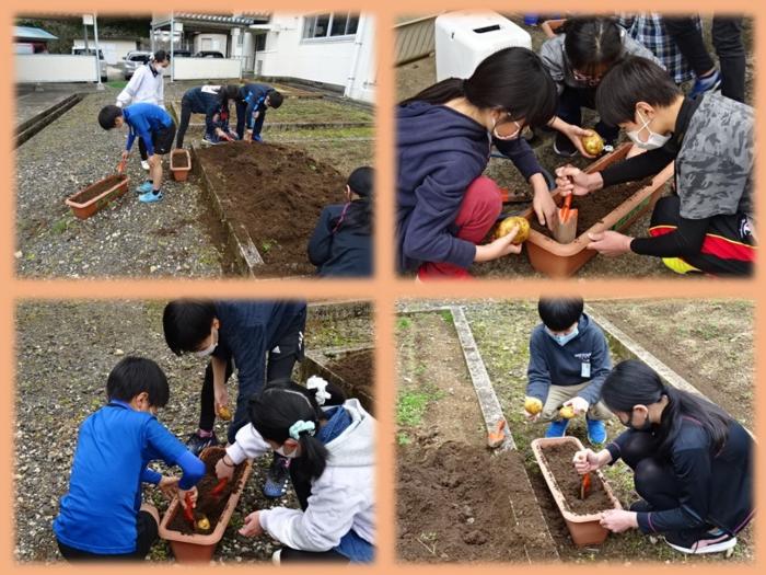 5年理科 ジャガイモの植え付け 6年生の理科「植物の成長と日光の関わり」を調べる学習でジャガイモを活用します。