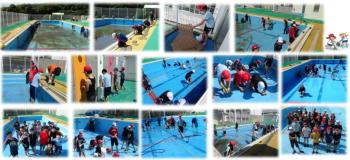 プール掃除をしてピカピカ!! 6月2日(火)、午後から5・6年生でプール掃除を行いました。晴天の下、デッキブラシ、たわし、雑巾などを使って、磨き上げました。