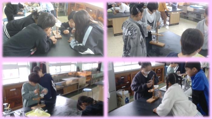 5年理科 もののとけ方 「水よう液にとけている食塩やミョウバンをとり出すことはできるのか調べよう」をめあてに学習を進めています。