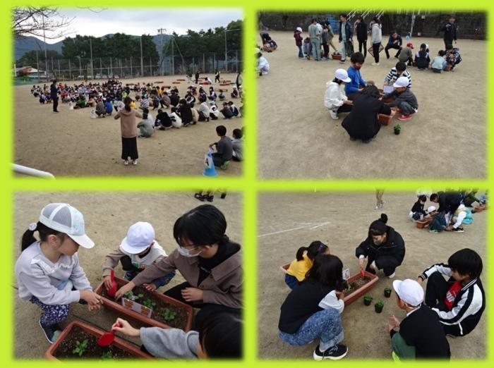 縦割り活動 「花の苗植え」 今回の縦割り活動は、5年生がリードして「花の苗植え」を行いました。