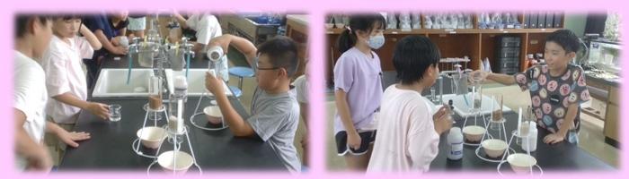 容器に「土」「砂」「砂利」を入れて、水をいれて、…