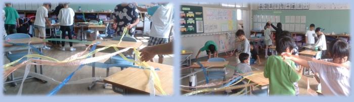 3年図工 ひもひもワールド    教室でグループごとに場所を決めて、ひもを結んだりつないだりして、場所の様子を変えることを楽しみました。完成後は、タブレットで撮影して作品を…