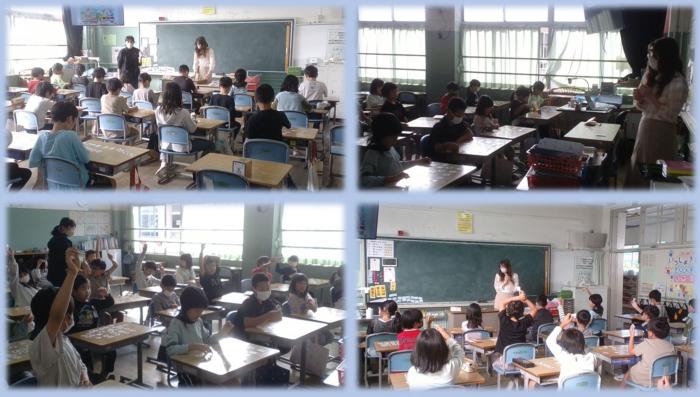 3年外国語活動    今日は、ALTのシャーロット先生が来校しました。シャーロット先生が色と形を読み上げ、そのカードを探すゲームなどを行いました。