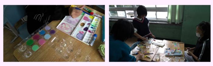 図画工作科「水から発見!ここきれい!」の学習では、色水を使って造形遊びをしました。 透明な容器に水を入れて絵の具が溶ける様子やたくさんの色…