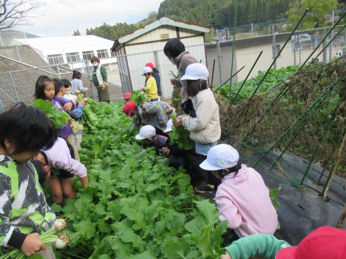 カブを収穫しました【1・2年生】 「明るい社会づくり運動推進協議会」様より補助をいただきました本校の菜園で、立派なカブが育ちました。今日は、1,2年生が収穫です。