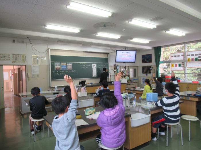 理科って楽しい!【4年生研究授業】 4年生が自主研究授業に取り組み、校内で理科の学習を公開しました。