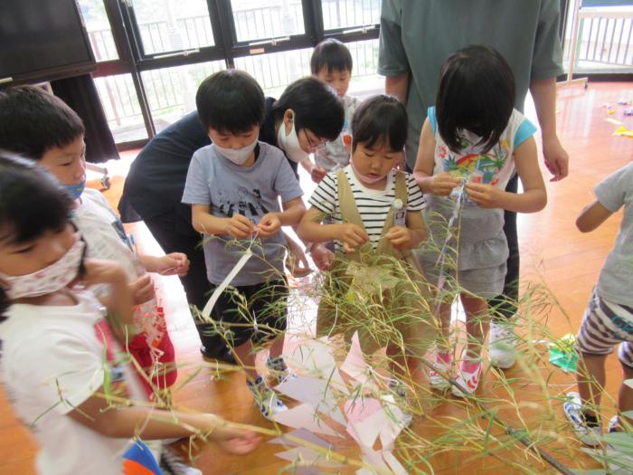 1年生はたくさんの飾りをつくって、笹の葉にキレイに結び付けていました。まだ結ぶことがままならない子も多く…