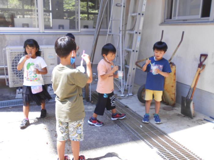シャボン玉飛んでいけ! 1年生がシャボン玉で遊んでいました。