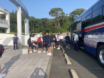 出発しました。 男女バレーボール部が予定どおり出発しました。すっきりとした天気の中、今日も活躍を祈ります。頑張れ、日野中。