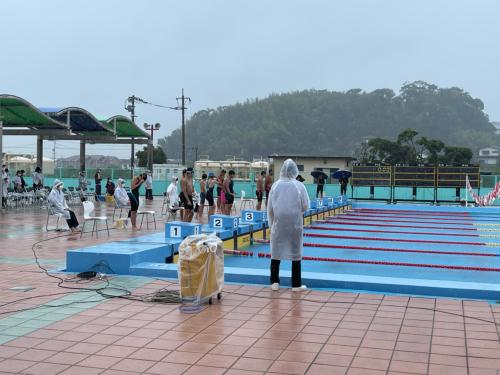 雨が降る中、参加した選手はすべて自己ベストを目指して泳ぎました。