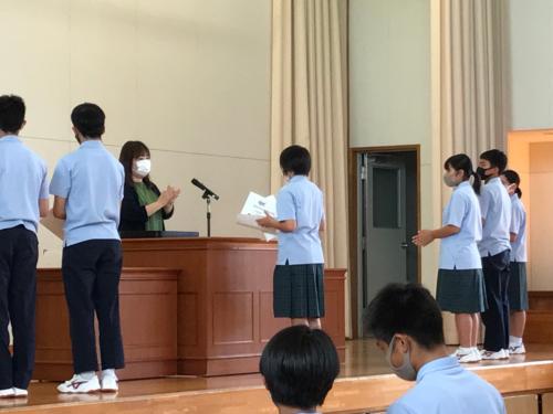 市中学校体育大会表彰式にて 6月12日〜14日(陸上競技、球技・武道)、18日(水泳競技)に行われた市中学校体育大会で本校の代表としてがんばった成果の表彰伝達を行いまし…