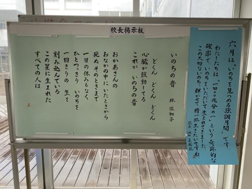 いのちを見つめる強調月間の取組にて 本日、校内研修も兼ねて、「命を美しくするため」を主題に研究授業を実施しました。いのちについては「たった一つしかない」「先祖代々つながっている…