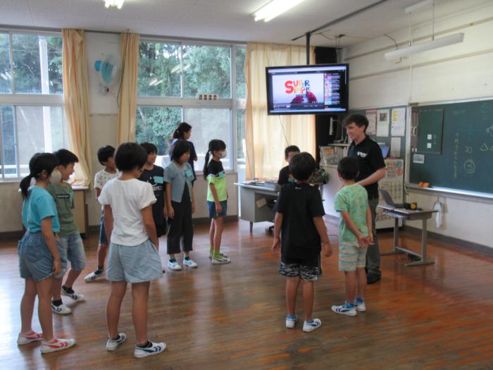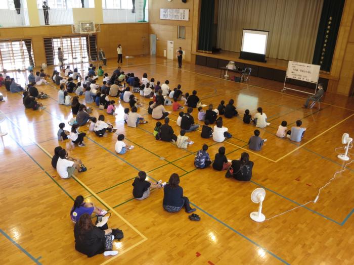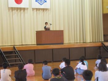 2学期始業式 8月中ですが、少し早い2学期の始まりです。どの子もよく日焼けした顔で久しぶりの友達との再会を喜んでいました。