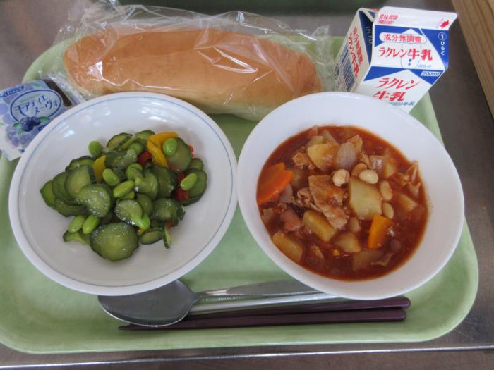 6月7日(金)の給食 今日の献立は、「牛乳・コッペパン・ポークビーンズ・カラフルサラダ・ブルーベリージャム」でした。今日は、ポークビーンズのひよこ豆、カラフルサ…