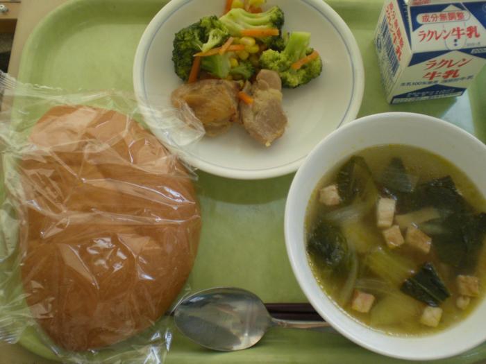 6月14日(金)の給食 本日の給食は、バーガーハウスパン、牛乳、チンゲン菜のスープ、ドレッシングサラダ、鶏肉のハニーマスタードでした。ドレッシングサラダは、ブロッコ…