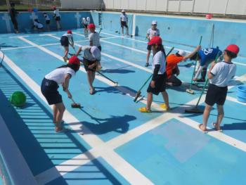 プール掃除 昨年度の反省をもとに、早めに準備を行い、プール清掃を行いました。日頃の掃除もよくがんばる北小っ子ですが、この日はいつにも増し、張り切って床や…
