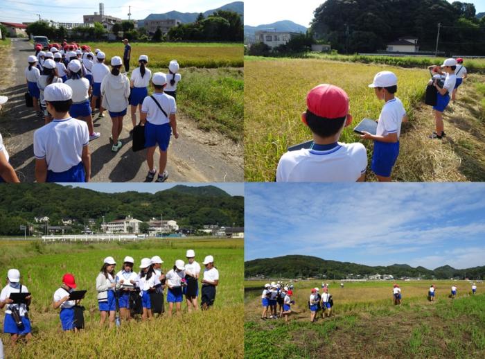 いよいよ来週です! 5年生が、地域の方に支えられて取り組んでいる稲作も、いよいよ来週10日金曜日に稲刈りの予定です。それに備えて、今日5年生が田んぼの様子を下見…