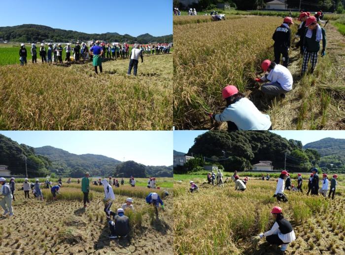 収穫の秋(5年稲作) 5年生が地域の方にお世話いただいて取り組んでいた稲作も、今日収穫となりました。昨今の気象状況の影響で、実りはよくないとお話しされましたが、田…