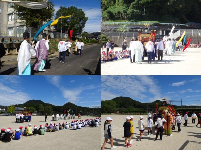 無病息災の御利益 江上小学校から江上支所に行く途中にある八幡神社の秋の例大祭が執り行われ、御神輿巡行で江上小学校へ御神輿が来ました。運動場で全校児童が出迎えま…