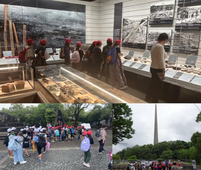 平和の尊さを感じて 4年生が平和学習で長崎の原爆資料館や平和公園、針尾無線塔の見学に行きました。平和公園では全校で平和への願いを込めた折鶴を献鶴してきました。