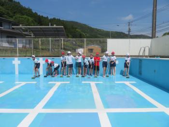 プール清掃 例年、プールの床面が剥がれるため、工事が済んだあと、プール清掃を行いました。