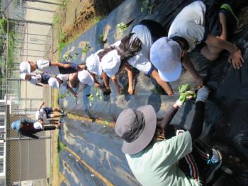 芋の苗差し 1年生が今年も芋の苗を植えました。学級園にて、これから水やりをしたり、草を取ったりしながら育てていきます。翌日には2年生も苗差しを行いました…
