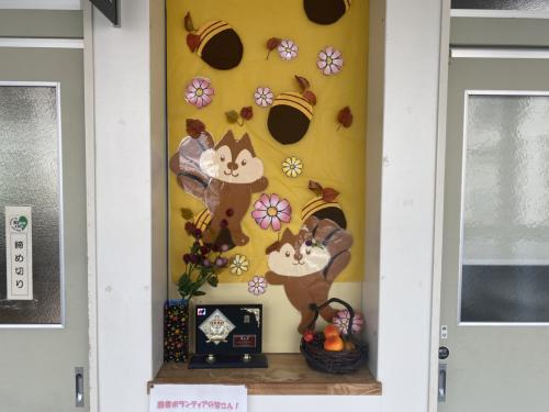 校内でも秋を感じさせる掲示物を図書ボランティアの方が展示して…