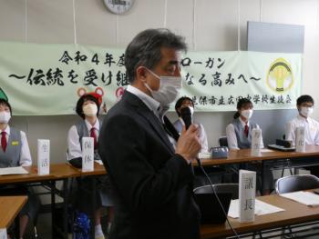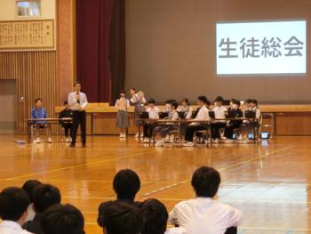 令和5年5月25日(木)、生徒総会が行われました。体育館に全員集まって開催することもできたのですが、コロナ禍の中、リモートによる総会をやってきたことで教室にいて話し合いをする方が効率がよいということになり、今年度もリモートによる開催となりました。議長の進行も見事でした。この経験を、これからの学級会など身近な会議でもいかしてほしいものです。