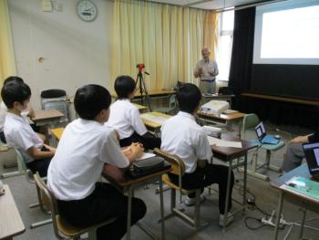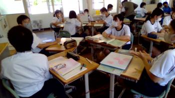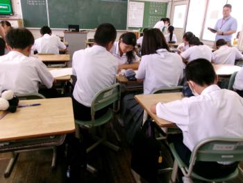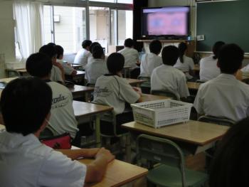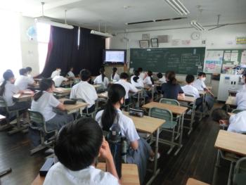 3年生対象の教室でした。講師に学校薬剤師の東島先生にお越しいただき、話をしていただきました。「薬物は、自分たちから離れたところのことではなく、身近なところにある」 という内容からはじまり、薬物乱用の恐ろしさについて生徒には十分伝わったと思います。