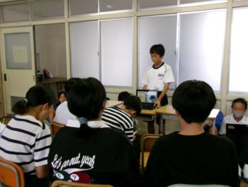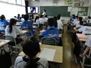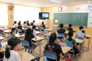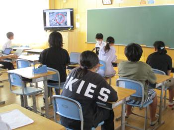 6年生と中学校1年生が総合的な学習の時間において、交流を行いました。6年生が国際交流のためにつくったプレゼンテーションを1年生にむけて発表しました。6年生は、総合的な学習の時間を使って日本へ留学している外国の方々へ、日本のよさを伝えるための発表を行います。その発表がよりよいものになるように、1年生にむけて一度、発表して改善点や修正点を見つけるための交流を行いました。6年生は、それぞれが考える日本独特の文化や自然についてわかりやすく発表しました。家の屋根に使われる「かわら」について発表する児童、「和装」について発表する児童、それぞれに、日本に住んでいる私たちも気づかない視点から調べた内容があり、1年生を驚かせていました。意見交換を十分に行うことができました。次回は、中学校1年生が、6年生に発表を行うことで交流します。