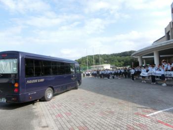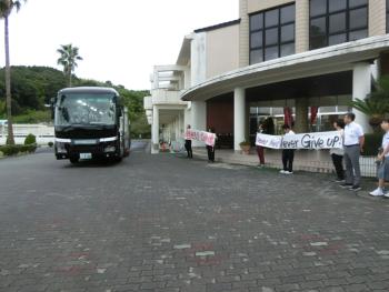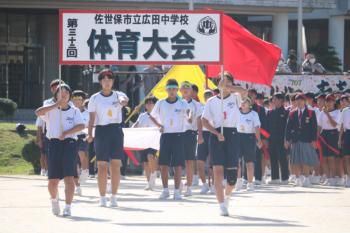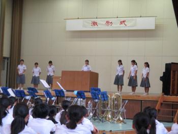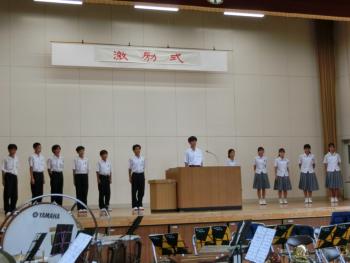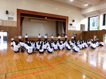 佐世保市中学校体育大会駅伝競走に出場する選手たちを激励する会を行いました。選手たちは、夏休みの早朝、自分の持久力を高めるため練習を重ねてきました。2学期が始まってからは、朝と夕方に練習を積んでいます。広田中学校の運動場は、選手の練習を励ます声「まだいける!もっとスピード出せるよ!」、「できるよ!」、「がんばれ!」という声が響いています。厳しい練習を続けてきた選手たちが、本番で力を出し切ることができるよう全校生徒で応援します。10月1日に佐世保市総合グラウンドで大会が行われます。