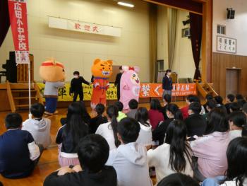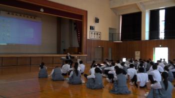 人権学習教室を開きました。佐世保人権擁護委員協議会、南部地区人権擁護委員協議会から講師をお招きし、講義と意見交流を行いました。前半は、「一歩踏み出す勇気」というタイトルのビデオを視聴しました。教室内でおこっているいじめにどのように向き合っていくか、友達と交流しながら考えていきました。交流を通して、相手の気持ちや存在そのものを尊重することが大切であることを確認し合いました。後半は、子育てを通して実感した人権意識を高めることの大切さについて講話していただきました。生徒たちは、それぞれの個性を尊重し合いながら関わっていくことの大切さを感じるとることができたようでした。最後に、タオルとペンのプレゼントをいただきました。大切に使っていきます。お忙しい中、広田中学校へお越しいただき、ありがとうございました。