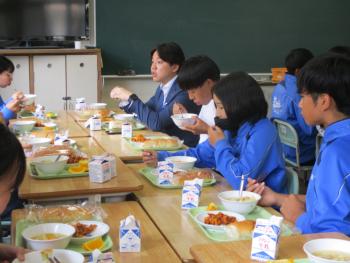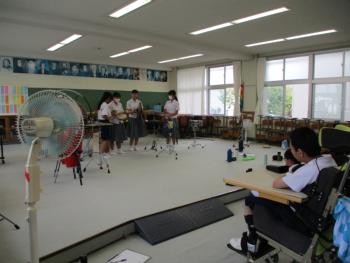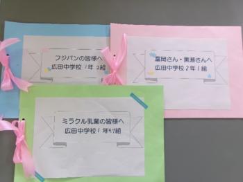 川棚特別支援学校の1年生が居住地交流のために広田中学校へ来てくれました。1年1組の学級活動で交流しました。仲間つくりのための、グループエンカウンターを行いました。ジェスチャーゲーム、ボール運びを通してふれあいました。給食は、輪になって食べました。いつも以上になごやかな雰囲気でおいしく給食をいただくことができました。休み時間には、交流でふれあった1組だけではなく、他のクラスの生徒とも会話する姿がありました。今後もお手紙のやりとりをして交流していく予定です。