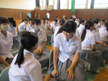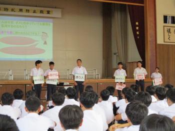3年生を対象に薬物乱用防止教室を行いました。シンナーが身体に与える悪い影響や市販の薬を用途以外に服用したり、服用方法を間違ったりすることで身体に与える影響などを生徒は真剣に聞いていました。さらに、大麻や危険ドラッグは若い世代に出回っていて、身近な友達や先輩から誘われて断れずに使用を始めるケースが多いことが紹介されました。親しい友達や先輩との関係性を保ちながらも危険ドラッグを断る方法をロールプレーイングをしながら考えていきました。断る方法として、「同じ言葉を繰り返す方法」、「違う話題で切り抜ける方法」、「逃げる方法」、「だって・・・、でも・・・、どうして・・・のDから始まる言葉で会話をきりぬける方法」などがあることを確認しました。