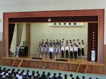 今年度の文化発表会は、表現力を育み、高めることを第一の目的として、合唱にクローズアップした会にリニューアルして開催しました。体育館には、合唱コンクールにむけた学級の意気込みを表現したポスターや曲のイメージを表現したポスターが掲示され、会の雰囲気を高めました。