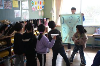 集会では、各学級委員長・副委員長の学級づくりの抱負発表、2名の教育実習の先生方からの挨拶のあと、学年レクリエーションを行いました。