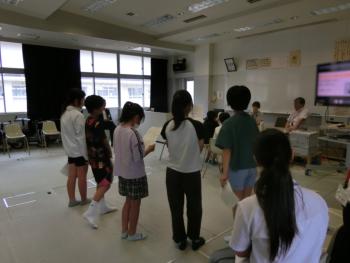 指導者の方からは、「お家の方にも見てもらってくださいね。くれぐれも、いきなり笑いだすと、おかしくなったと勘違いされるから、『狂言の「笑う」をするね』と言ってからやりましょうね。」とお話がありました。真剣に取り組みながらも笑顔があふれる、楽しいひと時になりました。
