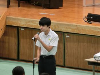 1学期終業式を行いました。各学年の代表者が1学期の振り返りと夏休み以降の抱負を述べました。3年生代表で振り返りを発表した岩永さんは、次のような発表をしました。一部を紹介します。
