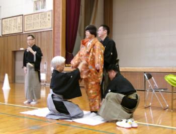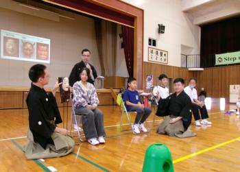 「摺り足(すりあし)」や能の「舞(まい)」、狂言の「笑う」声の発声など、全校児童生徒で体験する場面もありました。